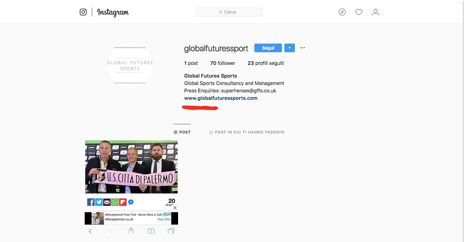 Cercando, cercando, alla fine è “spuntato”. Su Instagram è stato aperto infatti un profilo attribuito alla Global Futures Sports & Entertainment, la società che ha formalmente acquisito il Palermo e che si è presentata in città nei giorni scorsi. Il profilo però è davvero ridotto al minimo essenziale ed è stato creato solo nelle scorse ore; circostanze che fanno sospettare in molti che si tratti di un fake.