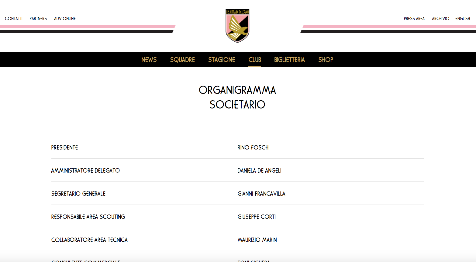 Il Palermo ha aggiornato il suo organigramma societario. L’evidenza arriva direttamente dal sito ufficiale del club rosanero, prontamente aggiornato dopo i comunicati e gli annunci dell’operazione di cessione guidata da Rino Foschi e Daniela De Angeli in qualità di garanti.