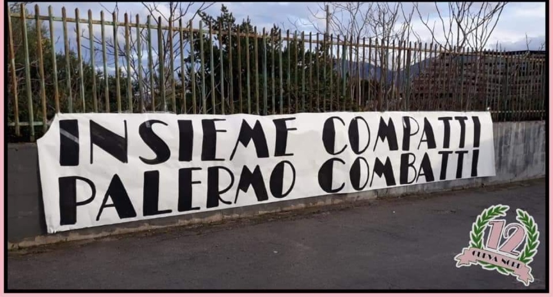 Di fronte ai cancelli del Tenente Onorato di Boccadifalco, la Curva Nord 12 ha lasciato uno striscione con un messaggio alla squadra: “Insieme compatti, Palermo combatti”.