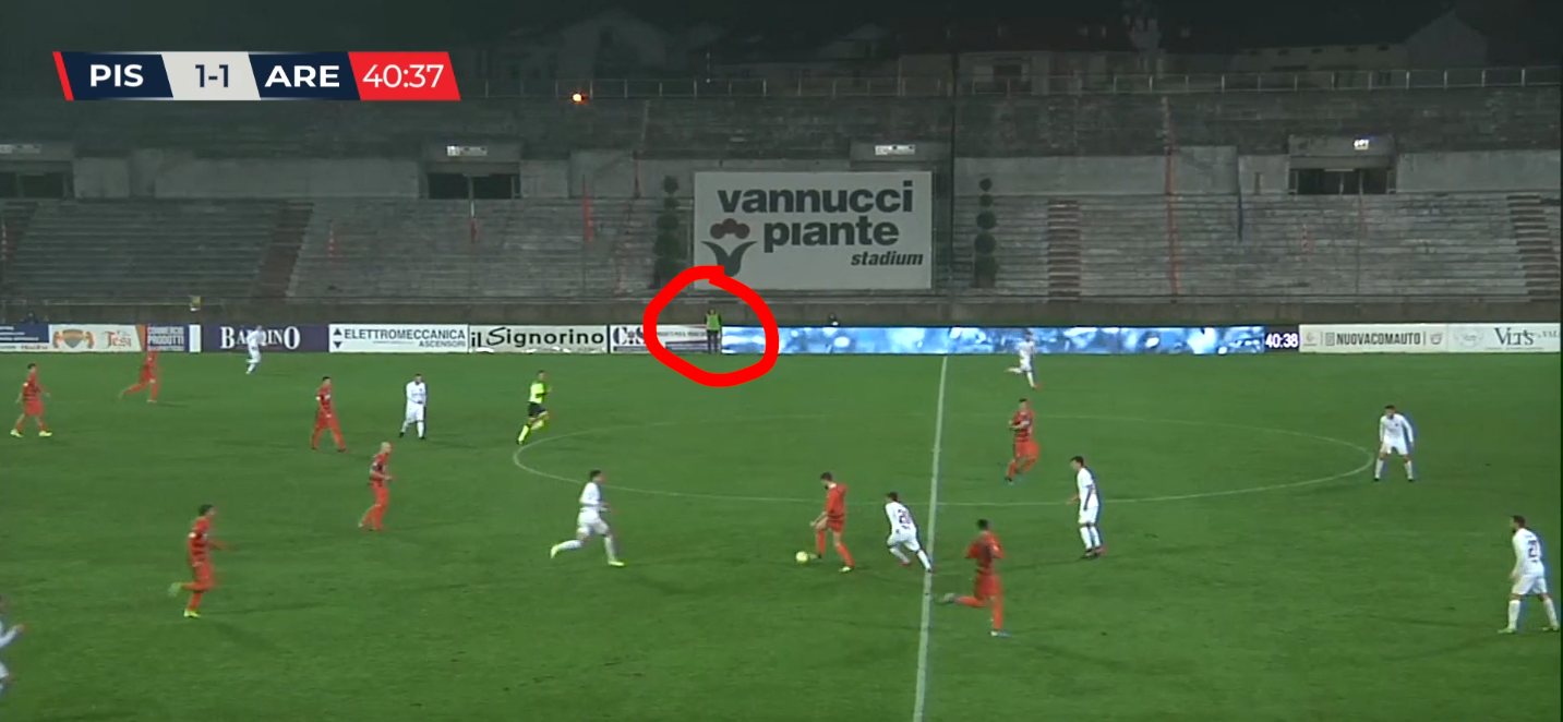 L’assistente ha riportato un problema di natura muscolare; a questo punto, l’arbitro e i delegati della Lega Pro hanno cercato in tribuna un altro assistente per sostituirlo. Dopo non averlo trovato, in campo ci sono andati i dirigenti delle due formazioni, uno per parte.