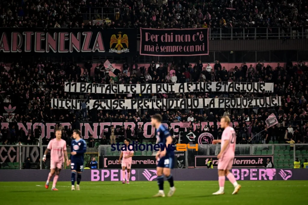 Sulla scia dello striscione è poi partito un coro che ha coinvolto tutto il settore: “Pretendiamo la promozione”. Un segnale chiaro di quanto i tifosi rosanero continuino a credere nell’obiettivo, nonostante la battuta d’arresto nell’ultimo turno contro il Pescara.