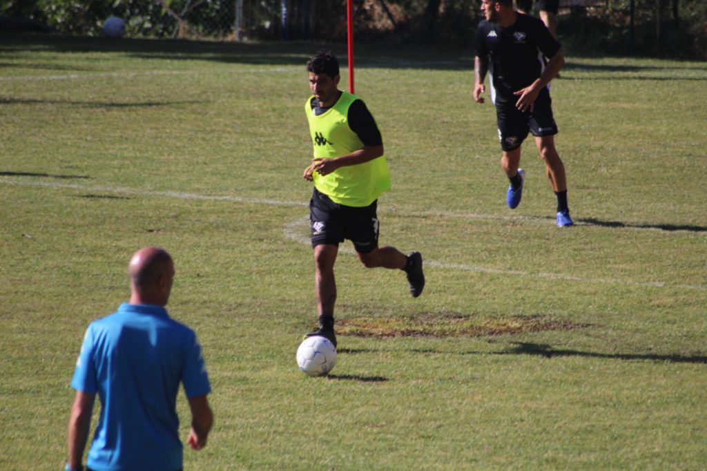 ORE 17.10 – Dopo il riscaldamento iniziano le esercitazioni tecniche col pallone: paletti in campo e squadra schierata, assenti sempre Marong, Ambro e Lucera. Ambro a bordo campo fa passaggi con Santana.