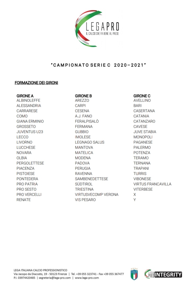 *DUE SPAZI SONO LASCIATI LIBERI PER FOGGIA E BISCEGLIE, CHE HANNO DIECI GIORNI PER COMPLETARE L’ISCRIZIONE