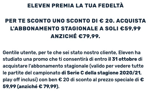 Schermata 2020-09-23 alle 11.11.33 Continue ReadingPrevious Serie C su Eleven Sports: ecco prezzi e modalità di abbonamento COMMENTA / VAI AI COMMENTILascia un commento Annulla rispostaIl tuo indirizzo email non sarà pubblicato. I campi obbligatori sono contrassegnati *Commento * Nome * Email * Sito web Salva il mio nome, email e sito web in questo browser per la prossima volta che commento. Δ
