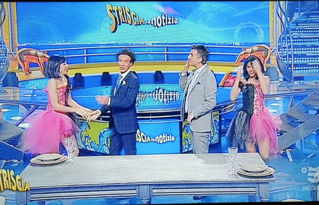 Shaila e Mikaela per il loro stacchetto e la puntata del giovedì hanno scelto un abito con bustino, lustrini e tutù rosanero. Ficarra e Picone ovviamente hanno apprezzato: