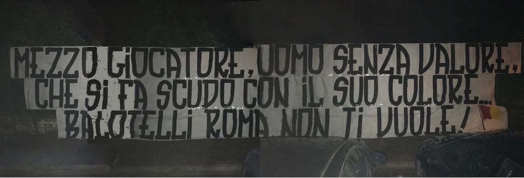 Il testo è molto eloquente: “Mezzo giocatore, uomo senza valore che si fa scudo con il suo colore… Balotelli, Roma non ti vuole!“. Di Francesco, nei giorni scorsi, si era dimostrato possibilista all’idea di vedere Balotelli con la maglia della squadra capitolina: “È un giocatore con qualità. Lo avevo già cercato quando ero a Sassuolo. A queste valutazioni però penseremo più avanti, perché dobbiamo ancora definire le strategie di mercato, ma sappiamo cosa serve”.