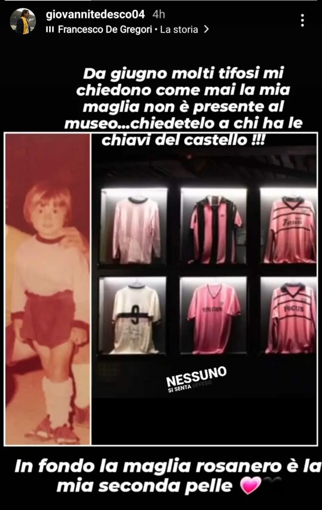 “Chiedete a chi ha le chiavi del castello”. Con sarcasmo pungente Giovanni Tedesco posta una storia sui social e sottolinea l’assenza della sua maglia all’interno del “Palermo Museum”, il museo ideato dal Palermo FC e allestito all’interno dello stadio Renzo Barbera.