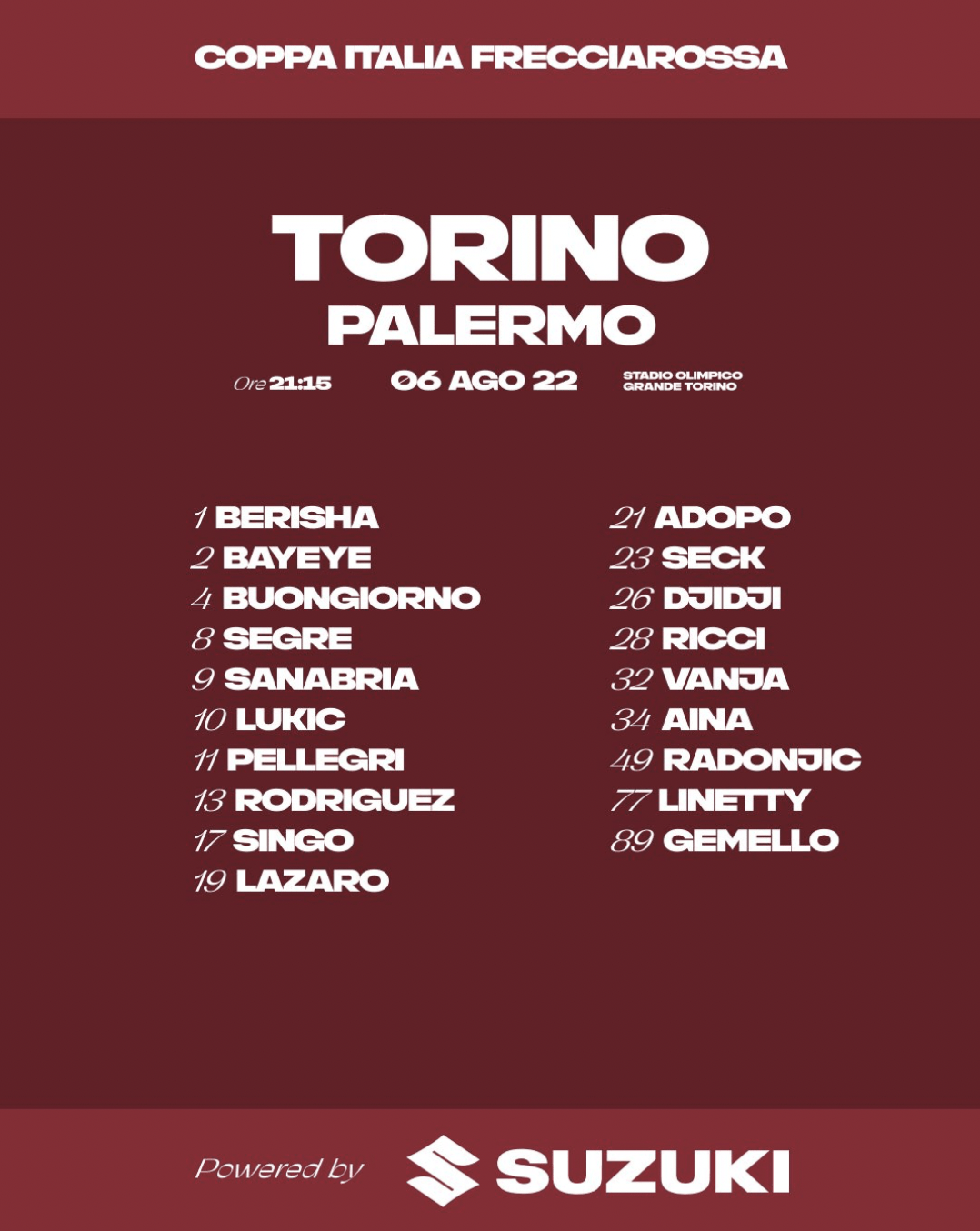In lista c’è Djidji, che si è ripreso da poco da uno stop fisico. Mancano, invece, tanti big fra i granata: Izzo non andrà neanche in panchina perché non ha recuperato la condizione migliore; poi, non ci saranno per scelta tecnica Verdi e Zaza.