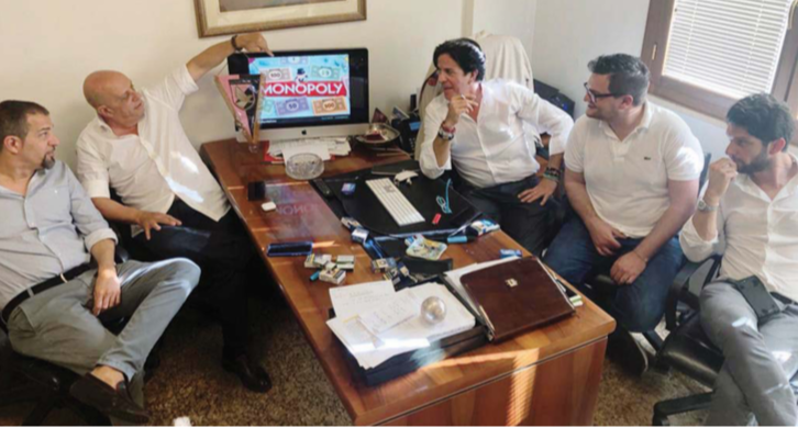 Lo staff di Arkus (famiglia Tuttolomondo e Stefano Pistilli) è riunito in ufficio e indica il gioco da tavolo: il riferimento è ovviamente alle parole di Joe Tacopina, che nei giorni di maggiore incertezza sul futuro dei rosanero aveva messo in dubbio l’iscrizione del Palermo parlando di “soldi del Monopoli” e restando alla finestra in ottica riammissione.