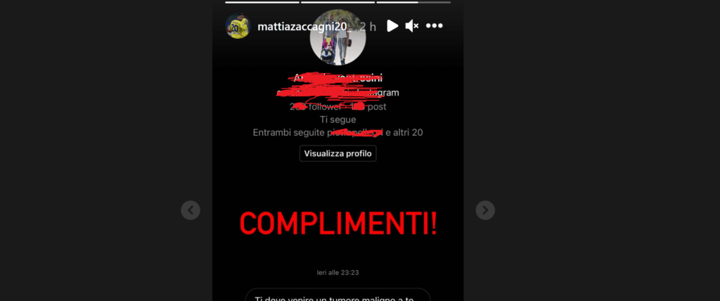 Ecco il contenuto del disdicevole messaggio: “Ti deve venire un tumore maligno a te e tutta la tua famiglia e pure se avrà un figlio dovrà avere un tumore maligno al cervello”. Una situazione già capitata ad altri calciatori e sicuramente da condannare.
