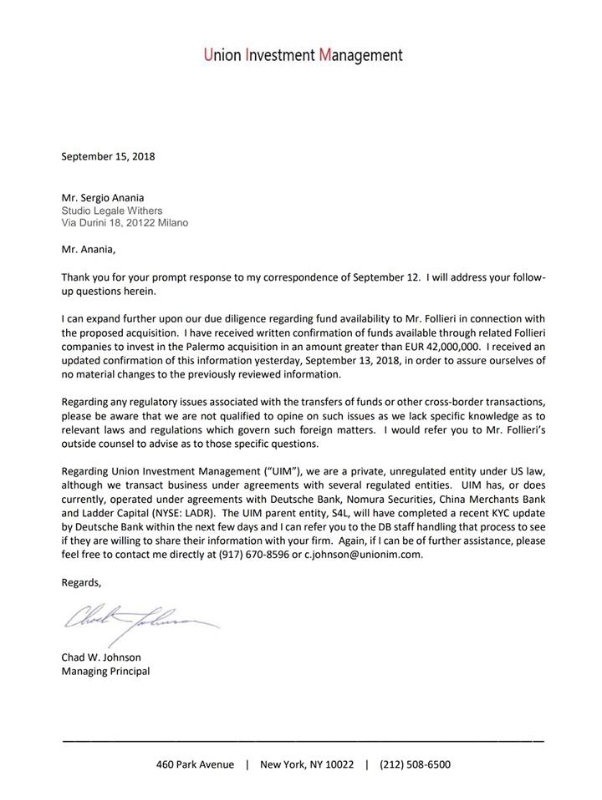 L’imprenditore foggiano ha poi citato nel comunicato altri due documenti che sarebbero alla base delle trattative portate avanti con Zamparini: una lettera di referenze datata maggio 2018 (che certificherebbe i rapporti di Anthony Podesta con la Bank of America) e una di evidenza fondi inviata da Chad Johnson all’avvocato Anania il 15 settembre 2018 in merito alla conferma della disponibilità di fondi per acquisire il Palermo calcio.