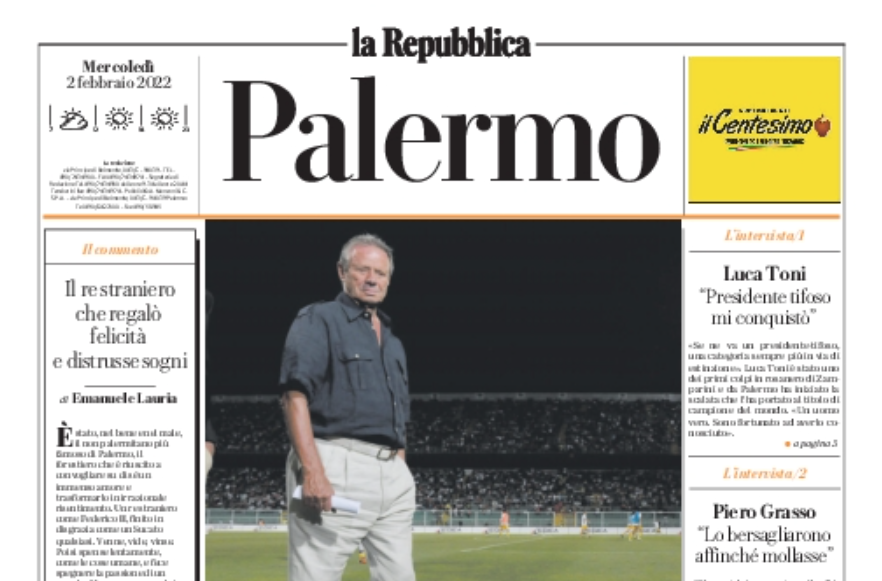 Come il Giornale di Sicilia (VEDI QUI), Anche l’edizione di Palermo de “La Repubblica” dedica la prima pagina (e le pagine iniziali di oggi) a Maurizio Zamparini e alla notizia della sua scomparsa, con editoriali e interviste a tifosi di eccezione. Il titolo a tutta pagina: “L’uomo delle stelle”.